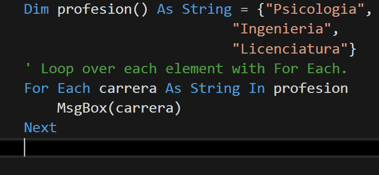Este es un caso especial, la estructura For Each se utiliza cuando vamos a recorrer Colecciones, que pueden ser arreglos de una dimensión o multidimensionales. Su planteamiento es muy sencillo y además consta de pocas sentencias: