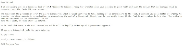 Esta modalidad es muy común y bastante parecida a la anterior, solo que esta vez el contacto no lo hace una supuesta entidad bancaria si no «alguien» que quiere depositar una cantidad generosa de dinero en tu cuenta, veamos el siguiente correo:
