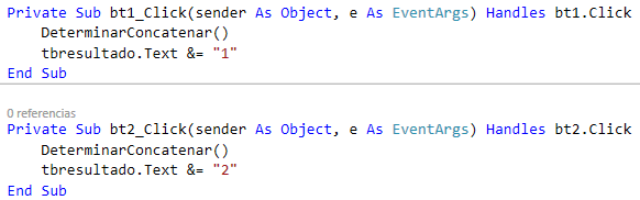Private Sub bt1_Click(sender As Object, e As EventArgs) Handles bt1.Click DeterminarConcatenar() tbresultado.Text &= "1" End Sub
