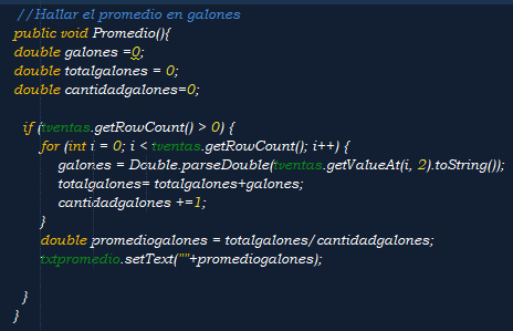 Recorremos la columna donde aparece la cantidad de galones, lo guardamos en una variable y a su vez con otra vamos sumando de 1 en 1, esta nos servirá para saber cuantos clientes han comprado galones de combustible. Por ultimo hallamos el promedio y con un setText mandamos el resultado a un label. -